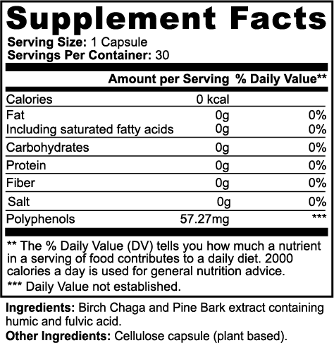 Answer 2: The capsules contain Birch Chaga and Pine Bark extract, rich in humic and fulvic acids, which are known for their antioxidant properties and for supporting gut health and nutrient absorption, aiding the overall health of your digestive system.*